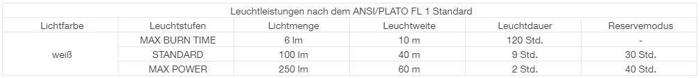 Leuchtkraft: 250 Lumen (ANSI/PLATO FL 1)